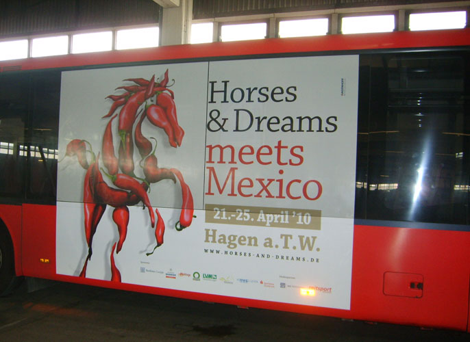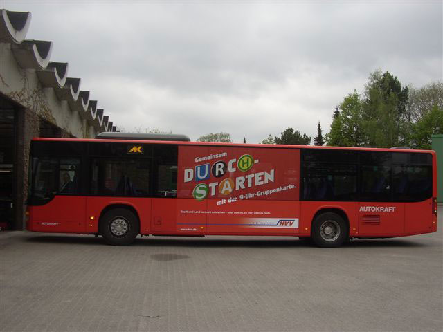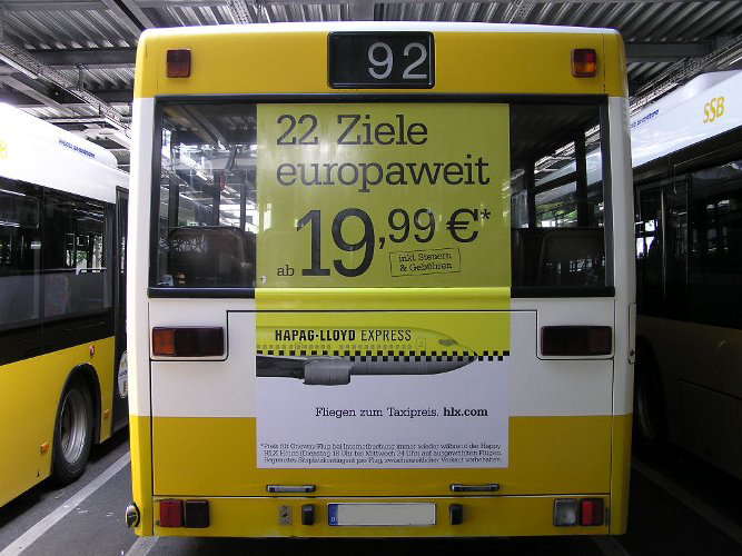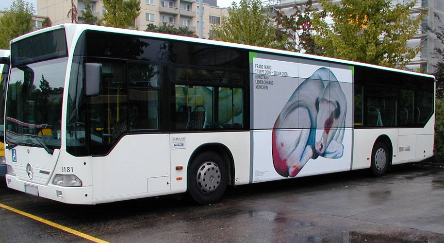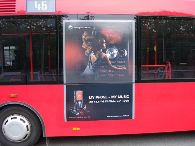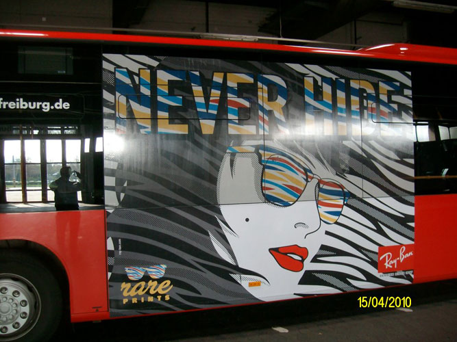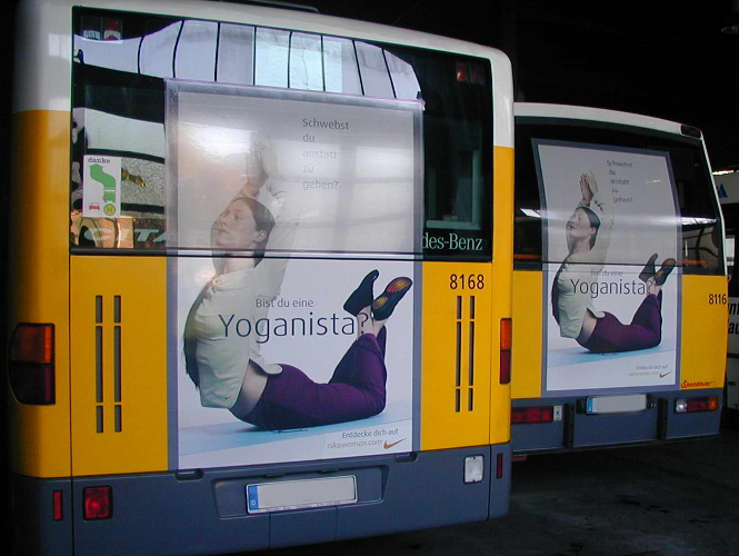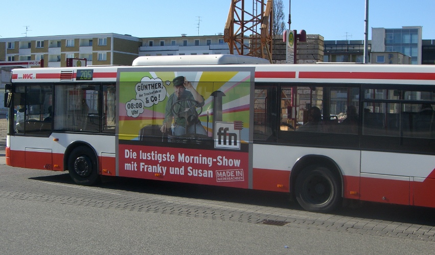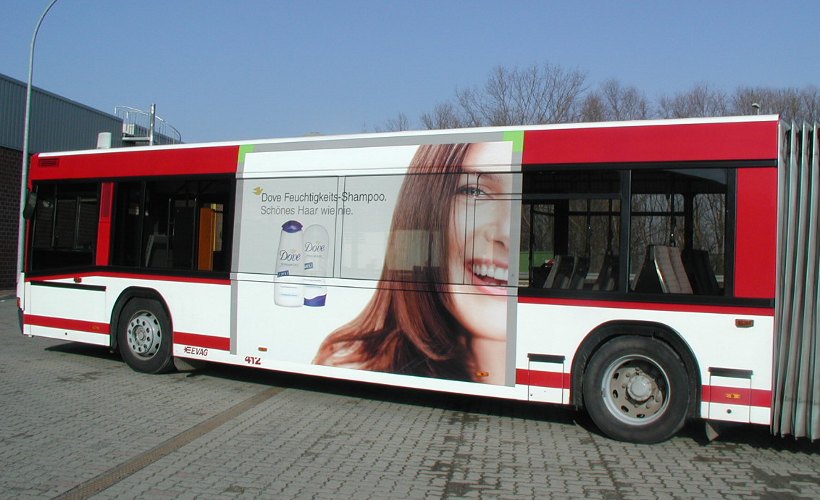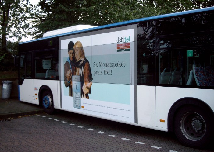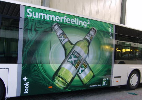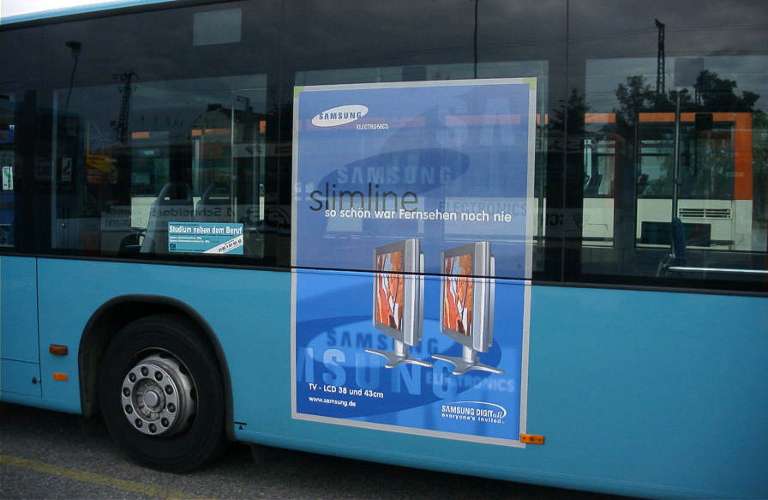 Hierbei wird ein 18/1 Plakat im bundesweiten Standardformat (252 cm x 356 cm) von uns auf die jeweiligen Fahrzeuge adaptiert und dann auf die Fahrbahnseite eines Busses oder einer Bahn – einschließlich der Fensterflächen geklebt.